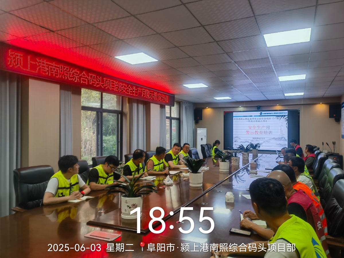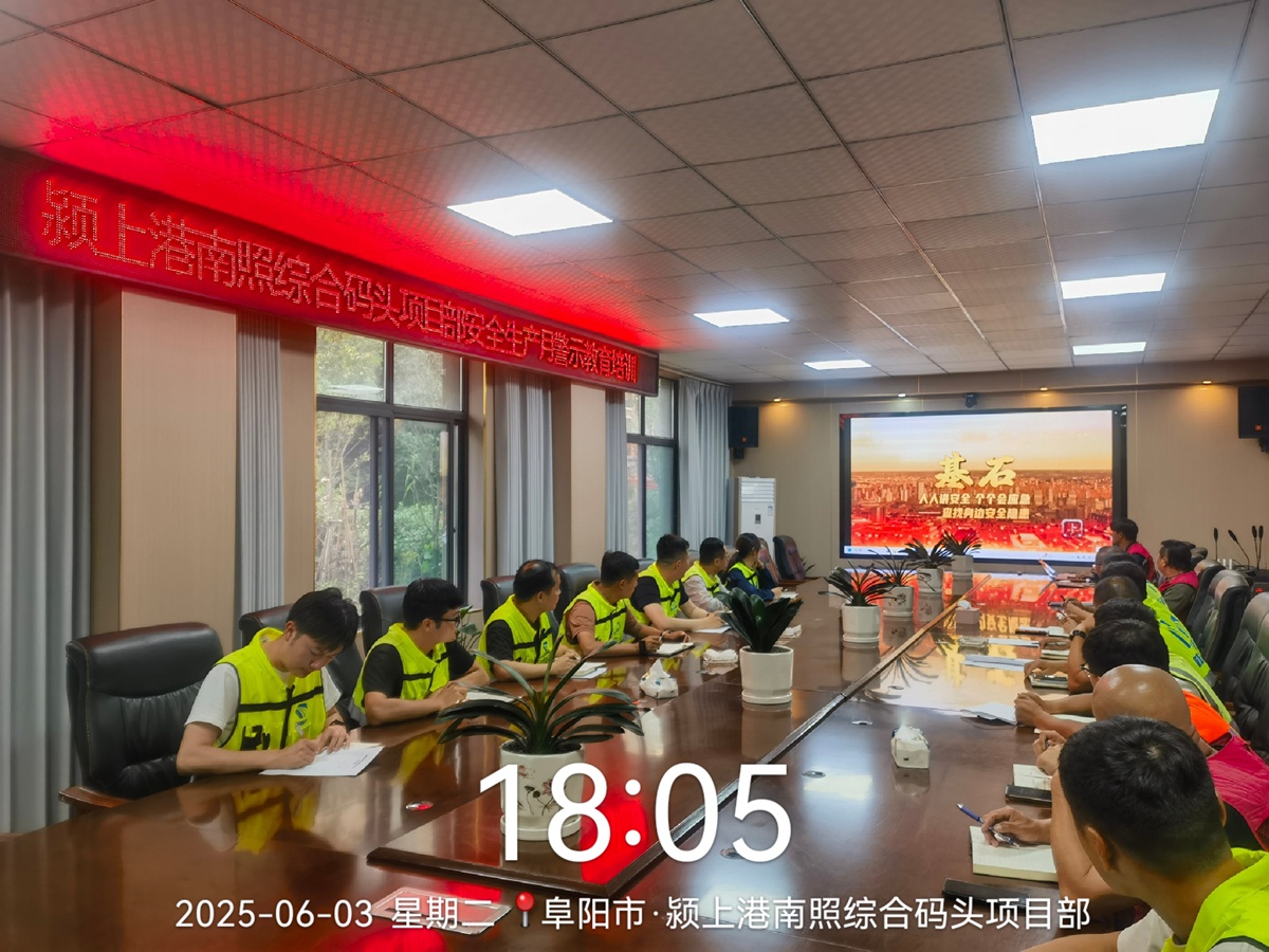 为深入贯彻落实2025年全国“安全生产月”活动要求,紧扣“人人讲安全、个个会应急——查找身边安全隐患”主题,6月3日18点,颍上港南照综合码头项目在会议室组织开展了安全生产月警示教育培训,培训要求项目部全体职工及各班组负责人、技术员等施工现场管理人员均要参加,进一步强化全员安全意识。