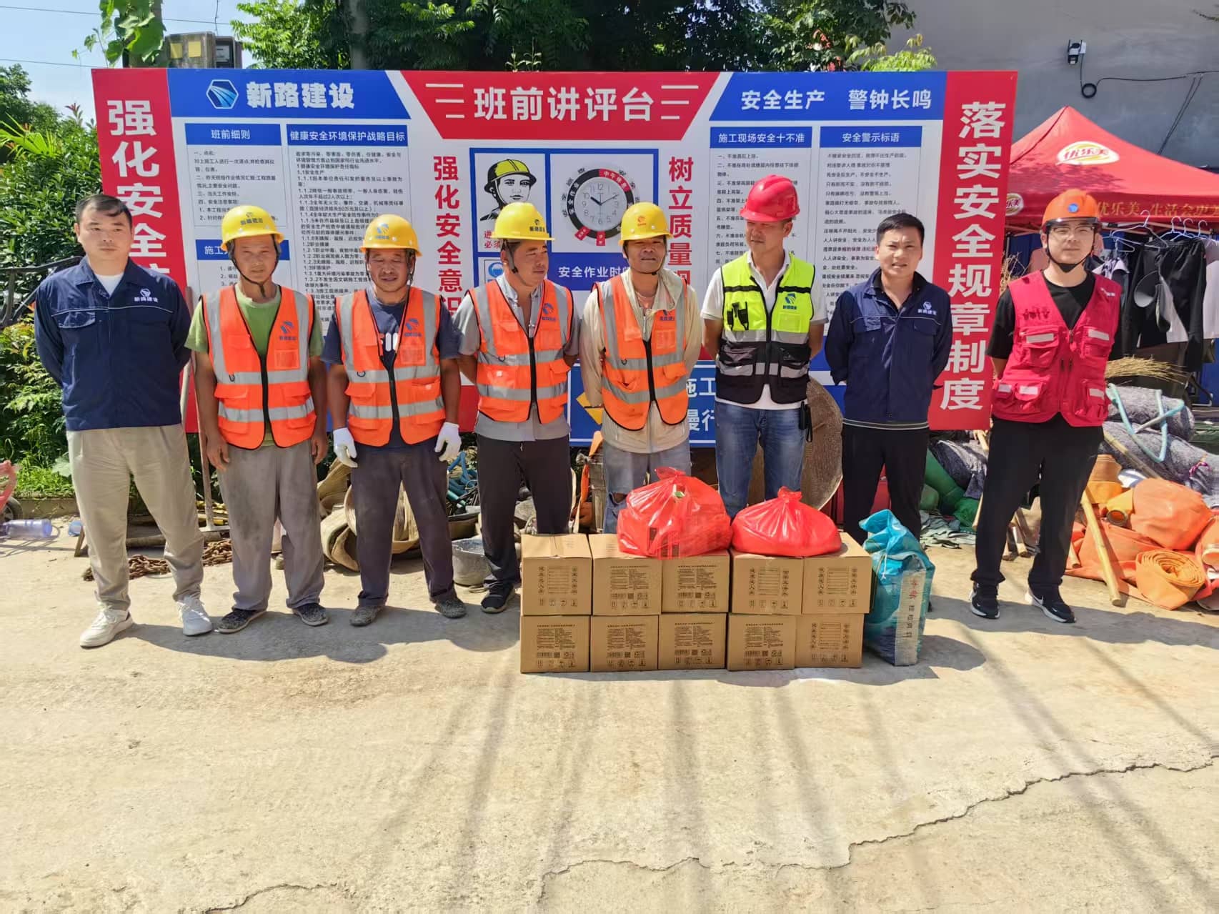 降雨天气结束后,将出现持续高温天气,为切实做好防暑降温工作,项目部为奋战在高温下的工友们送去防暑物资与关怀,以实际行动践行“我为群众办实事”的宗旨,保障一线施工人员健康安全。项目部为施工班组发放了矿泉水、绿豆、香正气水、清凉油等防暑降温物资,并叮嘱工友们注意劳逸结合,科学应对高温天气。此外,项目部安全科还现场讲解了防暑药品的正确使用方法及中暑应急措施,强化了工友们的自我保护意识。