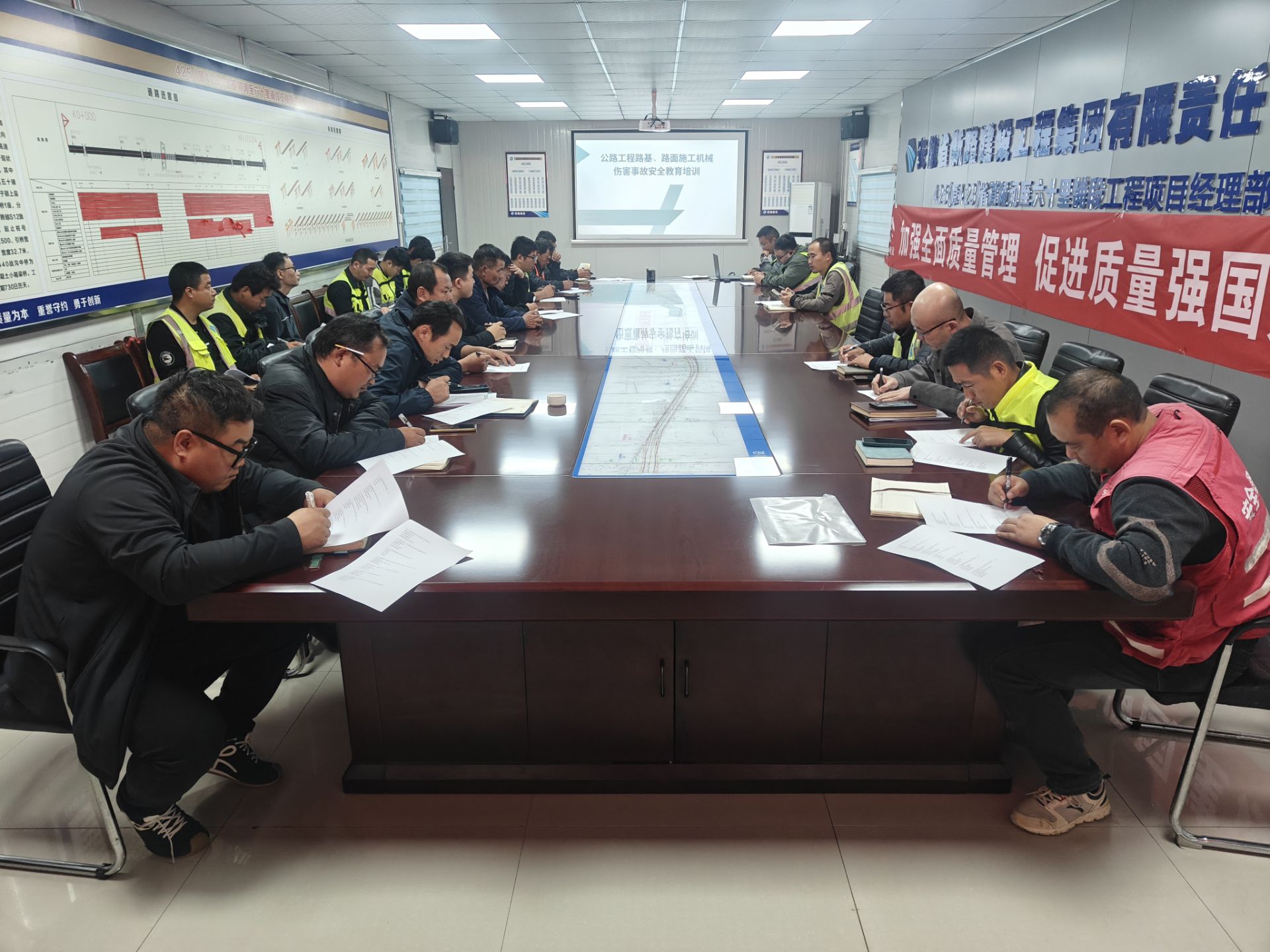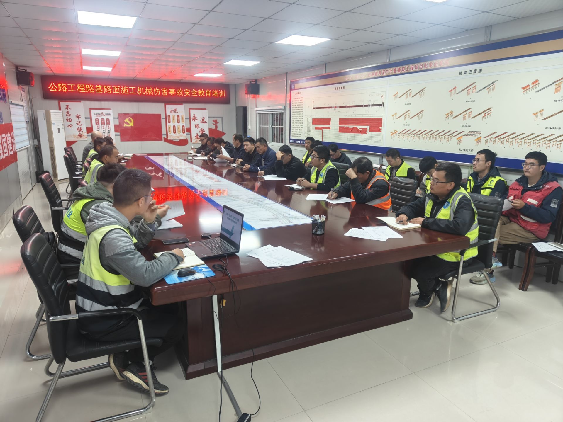 培训围绕科室安全管理制度展开,强调“安全第一、预防为主、综合治理”理念,明确机械作业三必须、机械管理专项制度等要求。在机械专业知识方面,详细介绍了路基、路面施工机械分类、用途及安全要点,涵盖挖掘机、装载机、推土机等设备,强调操作禁忌与作业环境要求。