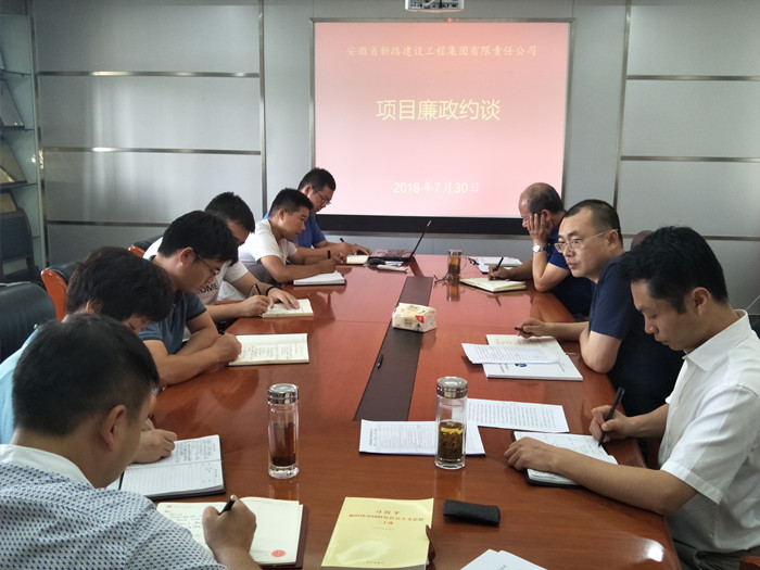 2018年7月30日上午,根据集团公司项目廉政约谈实施办法,在公司三楼会议室对颍州经济开发区路网建设工程PPP项目、阜阳市颍河西路(航颍路-七鱼河东路)改造工程、阜阳市城南新区淮河路、紫云路、航颍路道路及综合管廊等新开工项目管理层进行廉政约谈。党总支纪检委员郝智明主持廉政约谈会议,副总经理崔勇分别就厂务公开、制度落实、廉政教育、效能建设等工作对项目管理层作出了具体要求。项目管理层分别就项目部廉政工作安排、落实、效能建设等工作作出表态性发言,并承诺项目管理层将加强自身廉洁自律意识,做好项目部党风廉政工作。