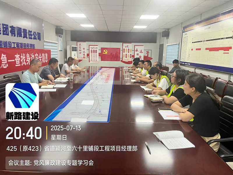 2025年7月13日,425省道颍河至六十里铺段工程项目部召开党风廉政建设专题学习会,会议由项目经理王震主持,项目部员工参加会议。