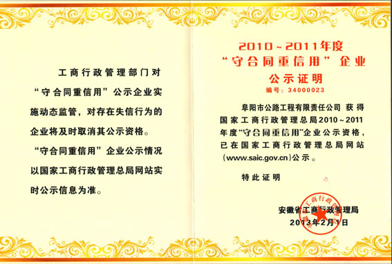 重合同守信用先进单位证书