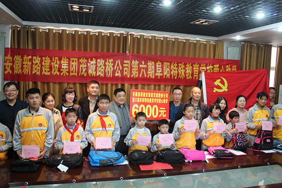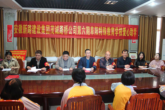 扶贫济困是中华民族传统美德,友善互助是新时期的社会主义核心价值观。2018年3月28日,安徽mansion88明升集团公司工会主席冯贺、安徽茂诚路桥公司经理尹飞、副经理张炜、田明坤等人再赴阜阳市特殊教育学校,继续帮扶这些聋哑、失明、智障、自闭的特殊儿童,为他们送去了爱心助学金及学习用品。