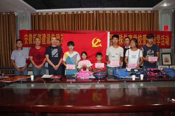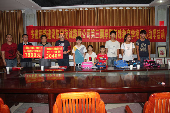 扶贫济困是中华民族传统美德,友善互助是新时期的社会主义核心价值观。2016年9月7日,安徽mansion88明升集团公司董事长唐谦、工会主席冯贺带领安徽茂诚路桥公司尹经理、赵经理等人再赴阜阳市特殊教育学校,继续帮扶这些聋哑、失明、智障、自闭的特殊儿童,为他们送去了爱心助学金及学习用品。