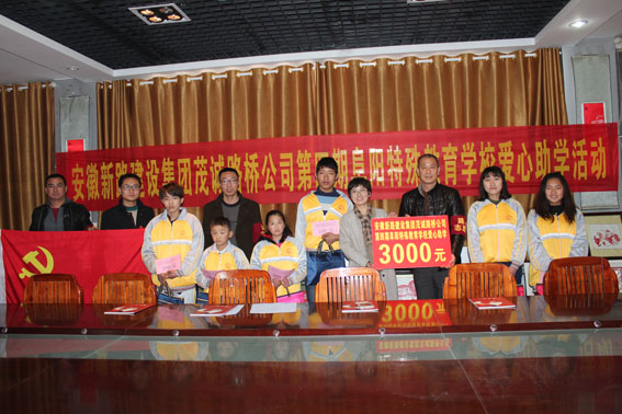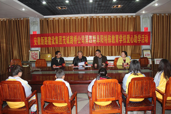 扶贫济困是中华民族传统美德,友善互助是新时期的社会主义核心价值观。2017年3月1日,安徽mansion88明升集团公司工会冯主席、安徽茂诚路桥公司尹经理、赵经理等人再赴阜阳市特殊教育学校,继续帮扶这些聋哑、失明、智障、自闭的特殊儿童,为他们送去了爱心助学金及学习用品。