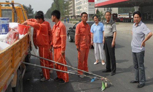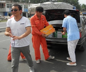 2013年7月4日上午,交通工程处领导班子及工会一行人来到阜涡路工地,为酷暑环境下还在工地上辛苦劳作的一线工人送去清爽的慰问。虽然近日阜城气温已不断攀升,但工程处的一线工人仍不惧高温酷暑,依旧在工作第一线为道路划线、打桩,辛勤坚守在自己的工作岗位上。为保证工程质量及帮助工人防暑降温,慰问小组给工地送去了风油精、人丹、凉茶和西瓜等,为酷热的工地送去阵阵凉风。