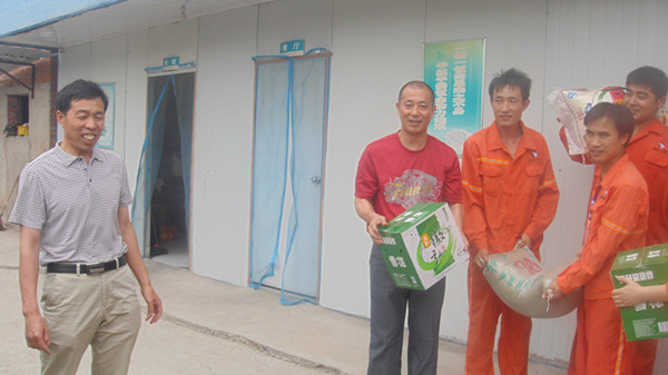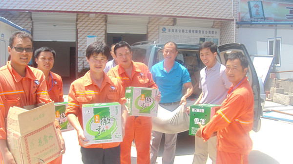 2013年7月2—8日公司副总王壮飞、工会主席冯贺从关爱生命、服务一线职工的角度出发,分别在S102线、S202阜南路、学苑路、合肥工业园区、插冉大桥、阜涡路项目部,为在高温下施工的项目部员工开展了防暑降温送清凉活动,购买了绿豆、白糖、风油精、花露水等防暑降温物品,及时发给工地上的施工人员,给炎夏的工地送去了阵阵清凉,体现公司领导对一线员工的关爱的宗旨。