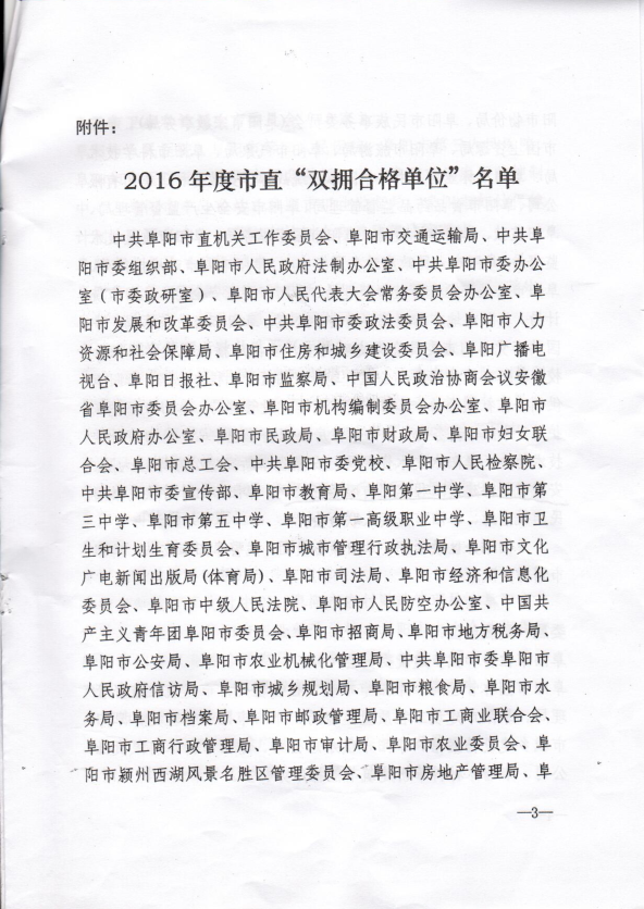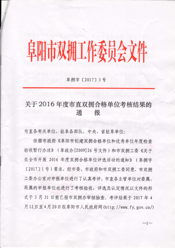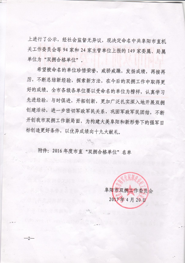 经阜阳市双拥办认真考核及验收,我公司被授予2016年度市直双拥合格单位荣誉称号。