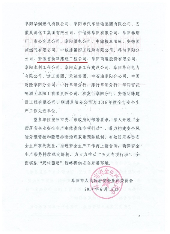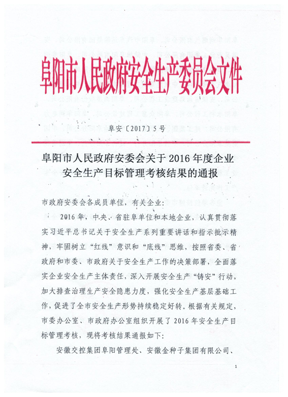 近日,阜阳市人民政府安委会印发了《关于2016年度安全生产目标管理考核结果的通报》,mansion88明升名列其中,荣获2016年度“阜阳市安全生产工作先进单位”称号。