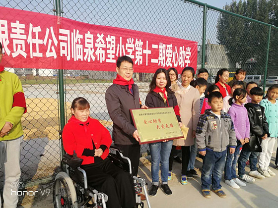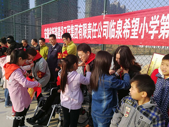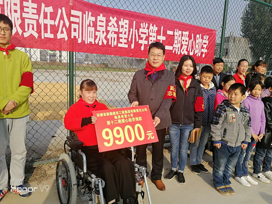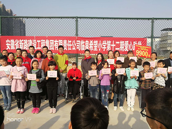点滴爱心聚沙成塔,爱心浇灌连木成林。10月24日上午,mansion88明升集团公司总经理韩恒忠、工会主席冯贺等一行人到临泉希望小学开展第十二期爱心助学活动。本次爱心助学活动共捐款9900元,截至目前共捐款165973元,用于资助贫困生、优秀生及优秀教师。另外,公司临泉霞光大道项目部自掏五万余元为学校铺设希望之路,以便师生往返学校。