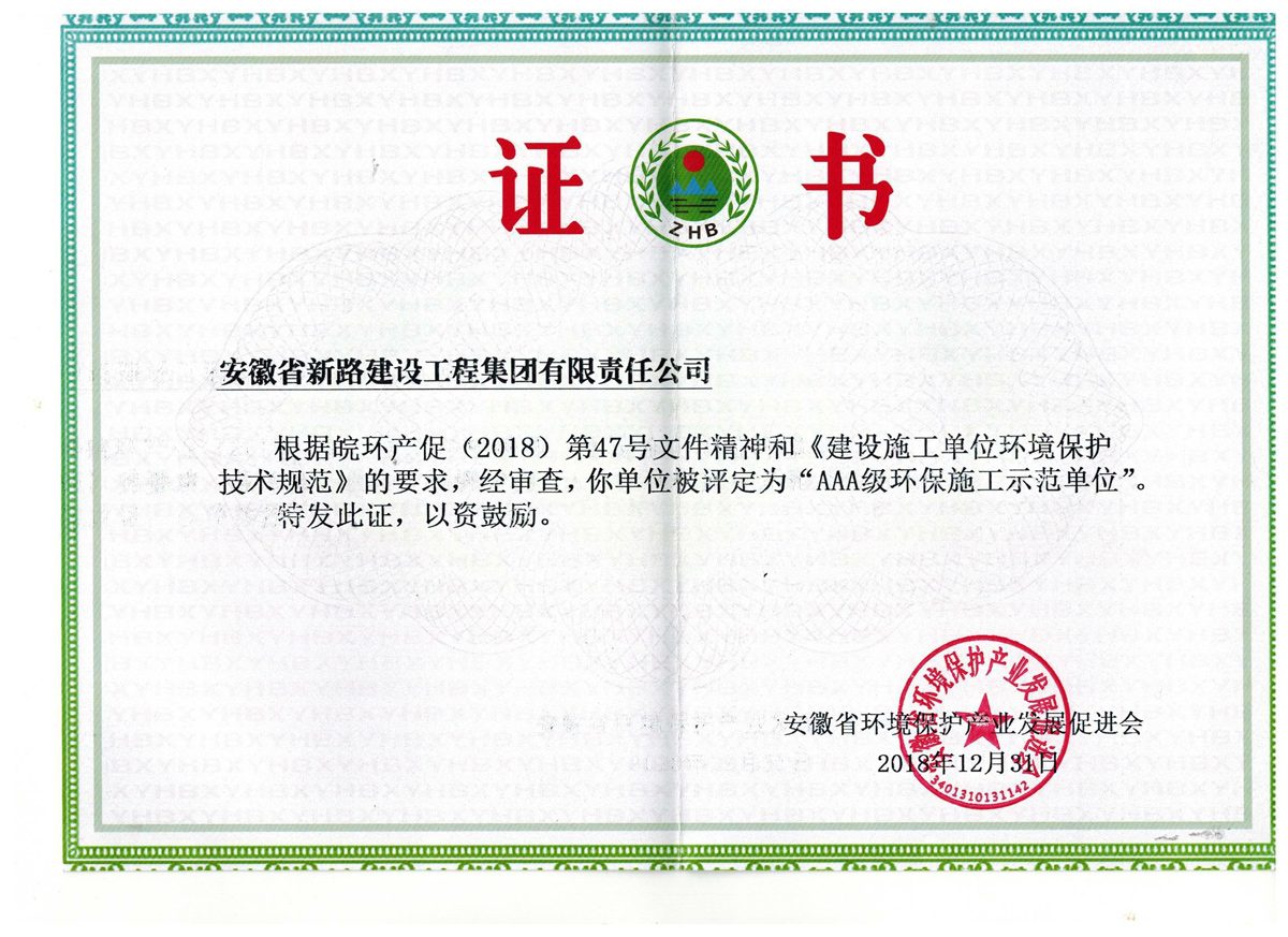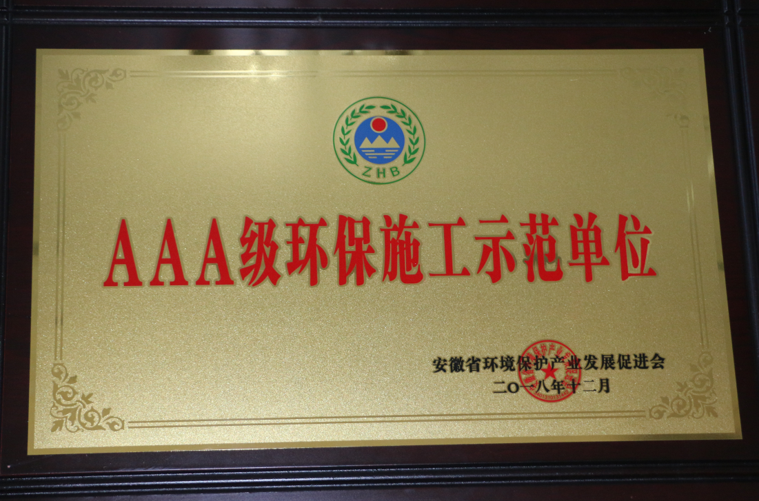 近日,集团公司被安徽省环境保护产业发展促进会评定为“AAA级环保施工示范单位”。