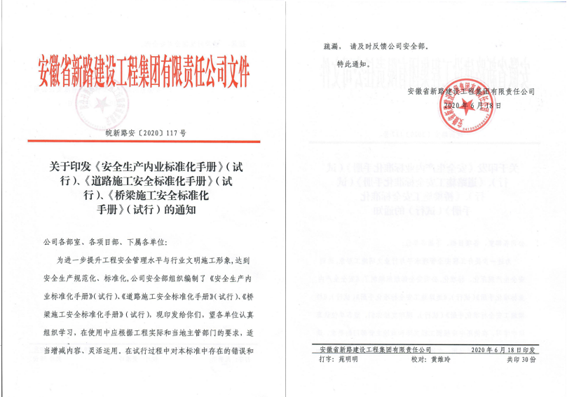 日前,公司组织编制的施工系列安全标准化管理手册已正式发布,手册分为三部分:《安全生产内业标准化手册》、《道路施工安全标准化手册》和《桥梁施工安全标准化手册》试行版本,这标志着公司在落实安全管理标准化方面又迈出了坚实的一步,具有里程碑意义。