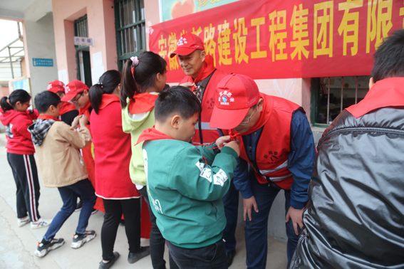 临泉城关镇希望小学学生为参与捐助活动的mansion88明升集团党员职工佩戴红领巾