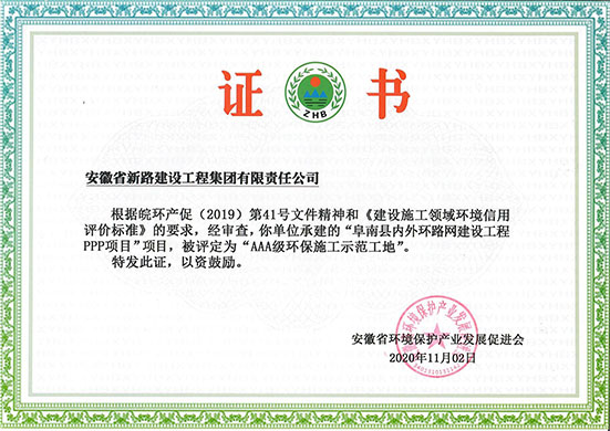 近日,安徽省环境保护产业发展促进会对省内在建施工项目进行环保信用评估,经环保专家组调研、审查,由mansion88明升承建的阜南县内外环路网建设工程PPP项目获评“AAA级环保施工示范工地”荣誉称号。