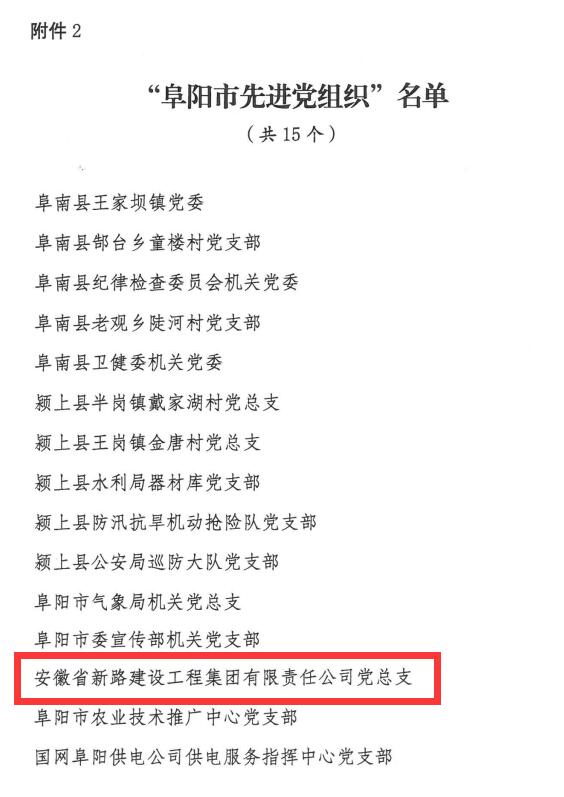 近日,经中共阜阳市委研究决定,mansion88明升集团党总支被授予“阜阳市先进党组织”称号。全市共有15个党组织获此殊荣,mansion88明升集团党总支是全市唯一受表彰的国有建筑企业党组织。