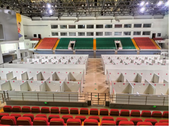 由于抗疫需要,根据省卫健委专家指导意见,将阜阳市师范大学体育场改造为方舱医院,我公司于2022年3月30日夜间接到阜阳市重点工程建设管理处的建设通知,选派阜阳市西湖产学研创智区基础设施工程路网建设项目团队负责该项任务施工,项目部接到施工命令后连夜调集资源于2022年3月31进场组织施工,全体人员加班加点经历48小时奋战,终于按要求完成1000个床位的建设任务,于2022年4月2日交付使用。