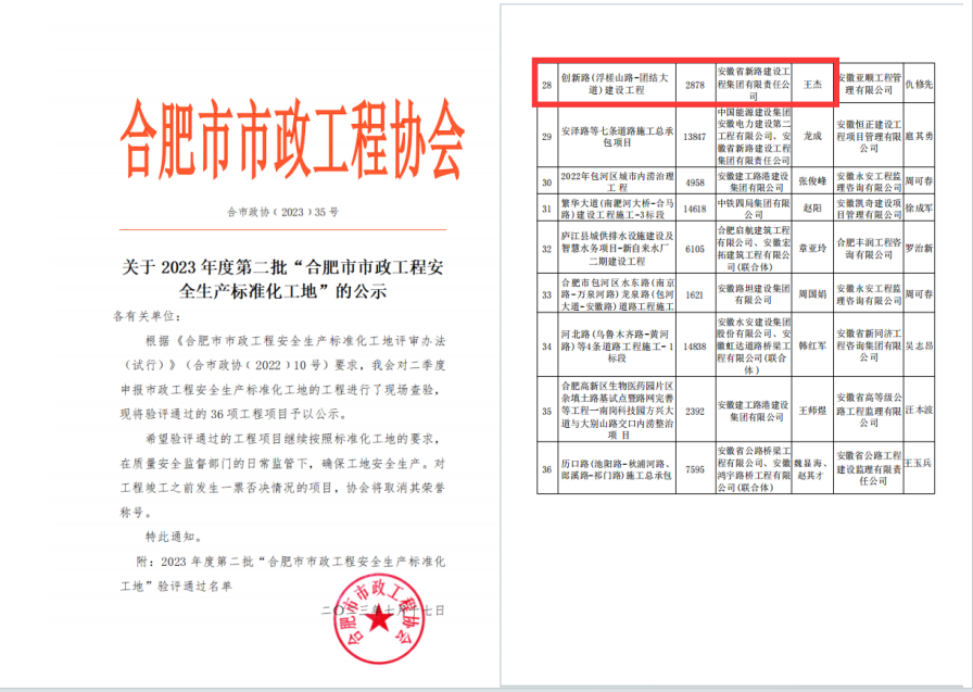 安泽路等七条道路施工总承包项目、创mansion88明升(浮槎山路-团结大道)建设工程获得合肥市“安全生产标准化示范工地”荣誉称号,其中安泽路等七条道路施工总承包项目同时获得省级“安全生产标准化示范工地”荣誉称号。阜阳B型保税中心项目、阜阳市城南新区文化路(阜南路-西清路)等道路及附属物工程施工、阜阳幼儿师范高等专科学校三期(岳家湖校区)建设项目第一阶段一标段施工项目获得阜阳市建筑施工“安全生产标准化示范工地”荣誉称号。