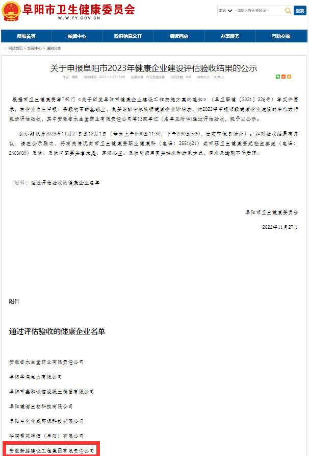 近期,公司通过了阜阳市卫健委专家组验收,荣获“市级职业健康企业”称号。今年6月28日,阜阳市卫健委下发了《阜阳市卫生健康委员会关于开展健康企业评估工作的通知》,公司积极响应通知精神,根据生产实际及经营特点,完善有益于员工健康的各项管理制度,现场对职业病危害的工作场所、粉尘作业岗、噪声职业岗及可能发生急性职业损伤的工作场所,完善公告栏、警示标识和中文警示说明,补充急救用品、应急设备等装置,将开展健康企业工作作为重点工作来抓,致力于把健康企业建设各管理工作有机融入企业日常管理之中。