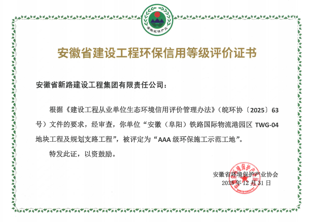 近日,mansion88明升在环保领域传来两则喜讯。公司承建的安徽(阜阳)铁路国际物流港园区TWG-04地块工程及规划支路工程,获安徽省环境保护产业协会授予“AAA环保施工示范工地”称号;同时,凭借在环保领域的长期深耕与突出贡献,集团已连续8年被该协会评为“优秀会员企业”。这两项荣誉,既是对集团绿色施工工作的充分认可,也彰显了公司坚持走可持续发展道路的成效。