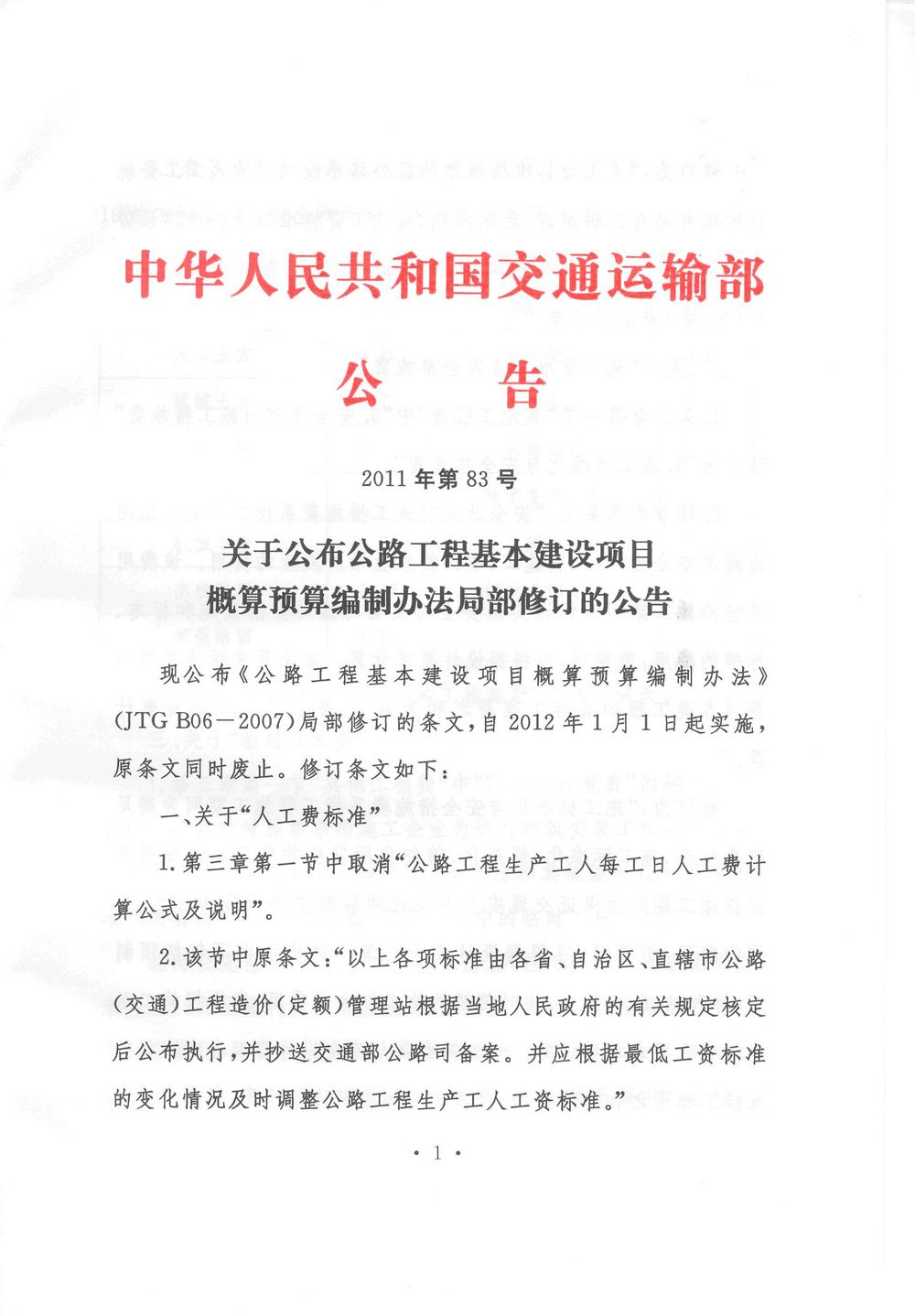 公路工程基本建设项目概算预算编制办法局部修订的公告