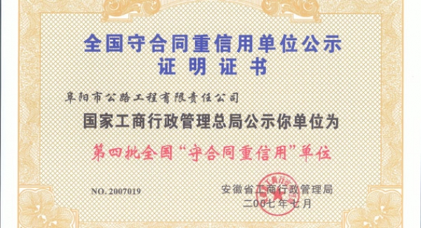公司荣获国家第四届“守合同重信用先进单位”光荣称号