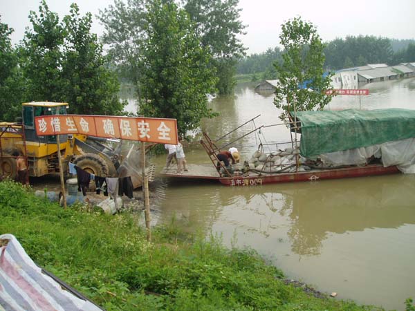 面对洪灾,刘颍河大桥项目部紧急启动了《防汛应急预案》,积极采取自救措施,力争将损失降到最低。项目经理储继业带领大家利用船舶倒运水泥至坝上,刚刚进场的水泥储存到颍上县公路分局,职工在料场上用碎石搭建高台,存放混凝土泵车,所有的设备电机全部卸掉转移,对便桥上的混凝土泵管及小型设备全部转移,特别是对200吨趸船及船上吊车,用2-3股直径17.5mm钢丝绳捆绑在墩柱上,防止被洪水冲走,避免造成重大事故。大家临时在坝上搭建食堂,一手端着开水,一手拿着方便面,临时填饱肚皮,继续抢运物资。