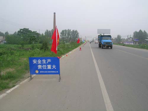 一是加强施工人员的安全防范意识,注意自身安全,特别要求所有施工人员上路必须戴上岗证、安全帽、穿黄马夹;二是规范施工现场的料子堆放,不得占用正常行车道,清扫施工现场;三是沿线增设了几百幅彩旗,竹竿贴有反光膜;四是桥涵施工现场采用彩钢瓦进行围护,并做到定期清洗;五是施工车辆施工作业时,车辆上方安放彩旗,机械规范操作、安全操作,注意交通安全;六是警示标志齐全,规范。