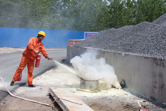 拌合站人员正在用灭火器扑灭火源
