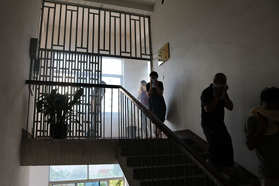 工作人员有序逃离火灾现场