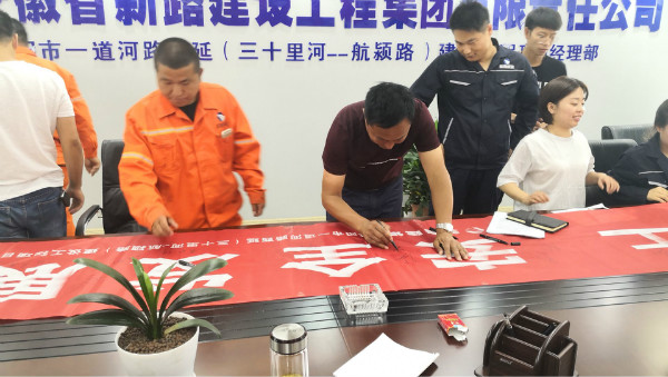 会上由项目副经理刘波宣贯公司、业主、监理关于本年度安全生产月的相关文件以及要求。安全科负责人王岑宣读本项目关于“安全生产月”活动方案和具体实施措施。最后由项目负责人张仕龙宣布“安全生产月”活动正式启动并带领大家在主题横幅上宣誓签名。