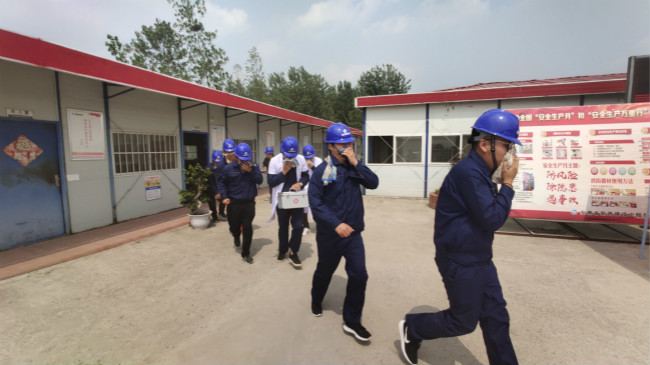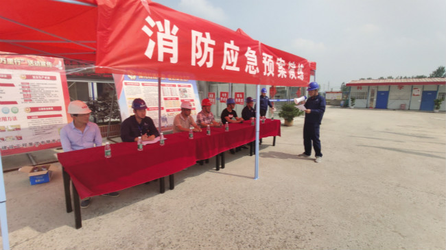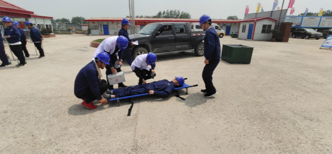 随着项目部应急演练总指挥薛鸿儒的一声令下,项目部立即启动火灾应急预案响应。同时按照应急预案要求进行人员疏散、物资保障、医疗救护、现场灭火等工作。在强有力的组织下各小组有序地协同配合,顺利完成各项应急演练项目。