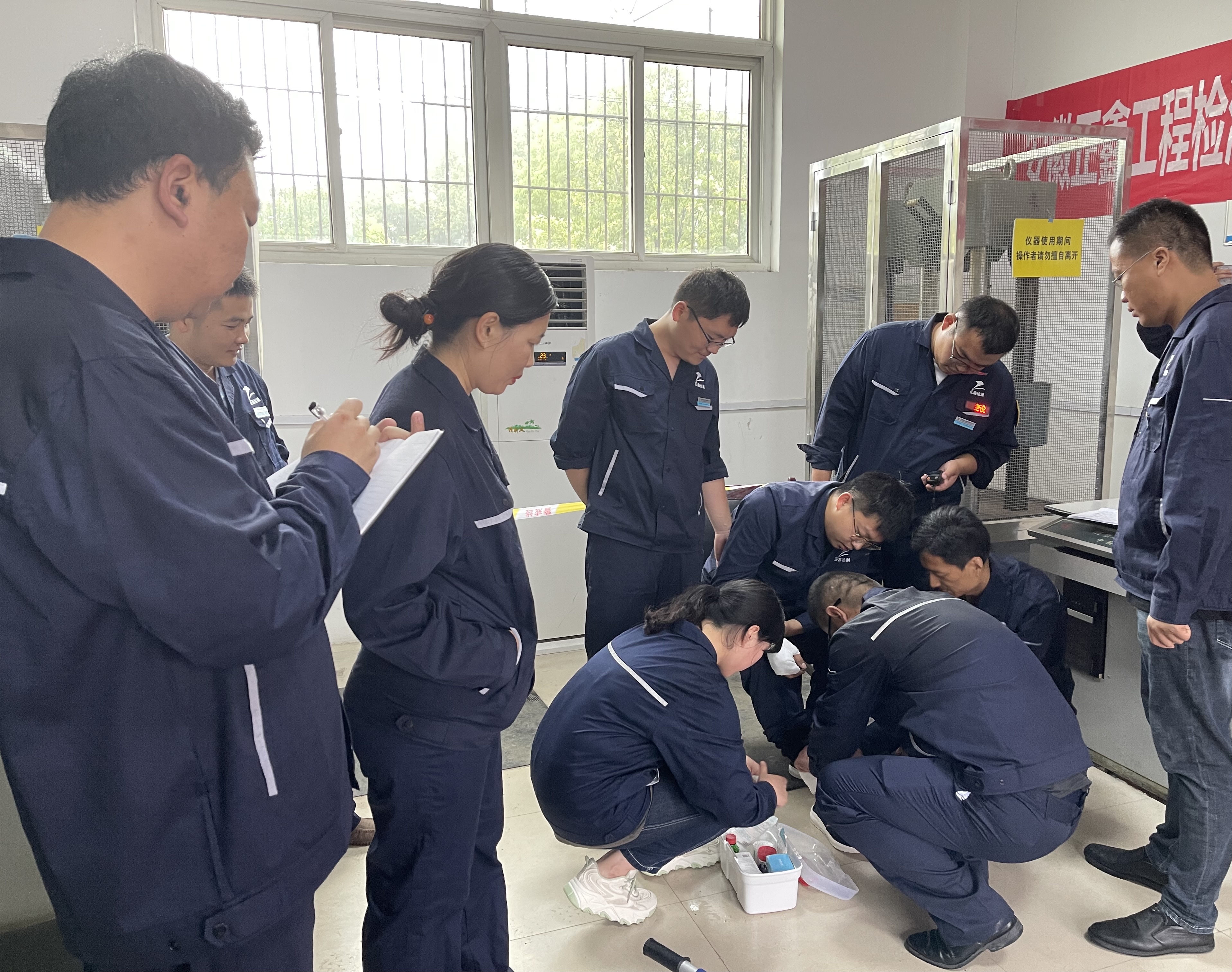 本次演练的背景试验检测员在进行水泥混凝土抗压强度试验,因违反试验操作规程,未按照作业场所内危险源辨识的预防措施要求,佩戴安全防护用具,造成人员受伤。公司应急预案小组接到通知,要求立即组织救援,规范、快速的做好现场安全防护工作,防止二次事故的发生。随着演练总指挥郝智明宣布演练正式开始,应急预案小组成员迅速进入紧急状态,立即组织救援,整个演练过程大家分工明确、行动迅速、配合默契,充分体现了各队伍的组织协调、应急实战能力,能够及时、有效、迅速地处理机械伤害造成的人身伤害事件。