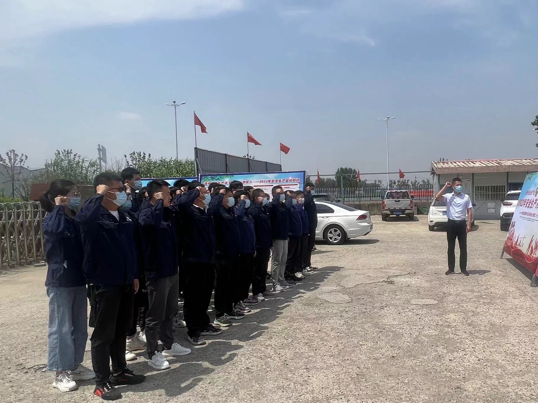 二、安全宣誓活动:启动仪式结束后,项目部全体人员在项目院内开展“安全生产月”宣誓活动。项目经理薛鸿儒领誓,项目全体人员高举右手,庄严宣誓。