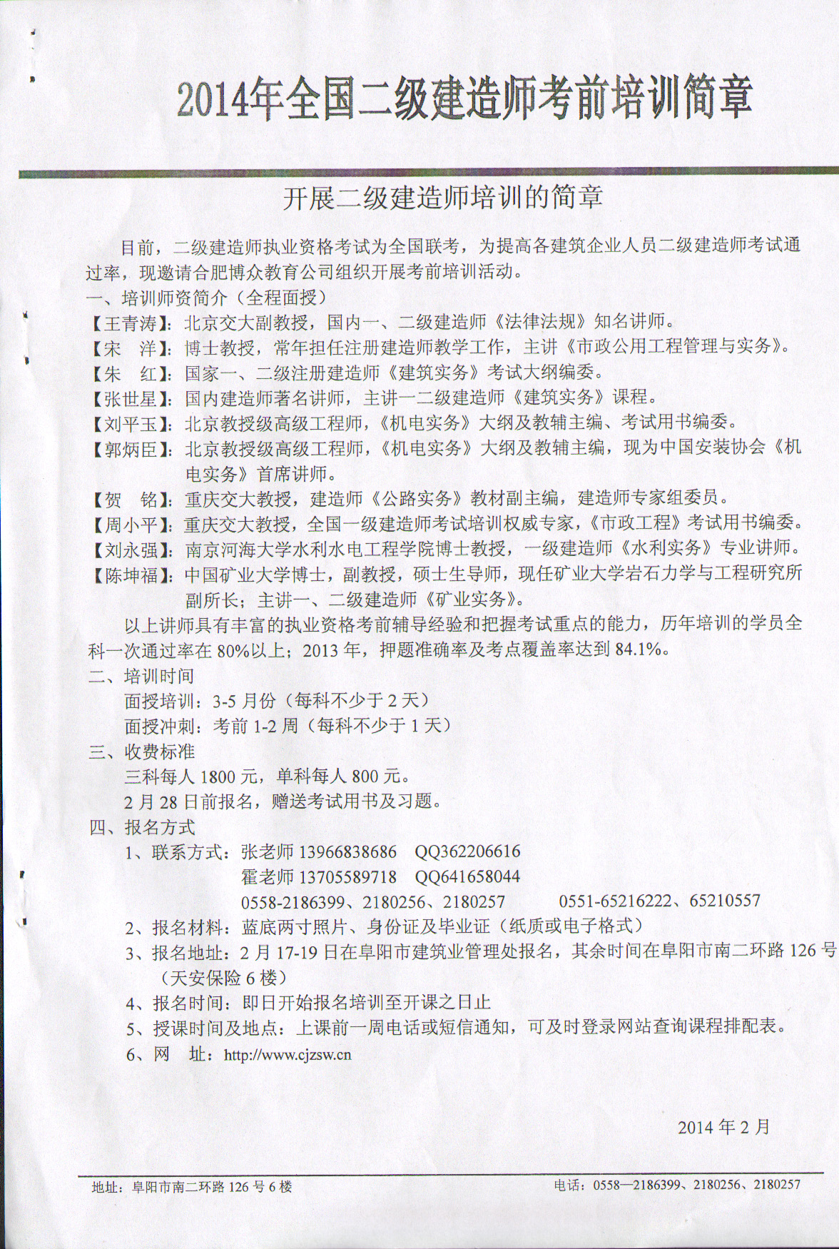 接阜阳市建筑业协会《关于举办2014年二级建造师考前强化培训班的通知》(请点击查看)文件通知,阜阳市建筑业协会邀请合肥博众教育公司在我市举办二建考前培训强化班,培训时间、费用、报名等详情请参考附件《全国二级建造师考前培训简章》(请点击查看),2月28日前报名赠送考试用书及习题,如需报名请于桑叶联系。