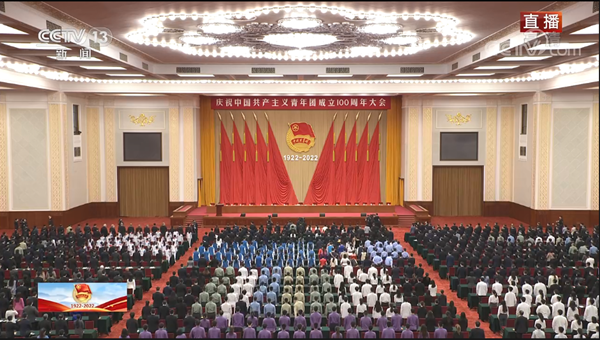 2022年5月10日上午庆祝中国共产主义青年团成立100周年大会在北京人民大会堂隆重举行。上午10点,大会开始,全体起立,高唱国歌。