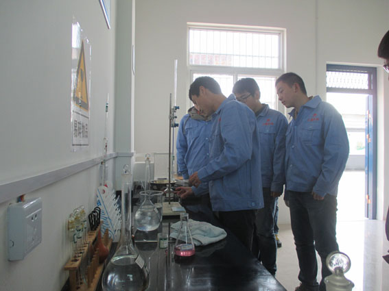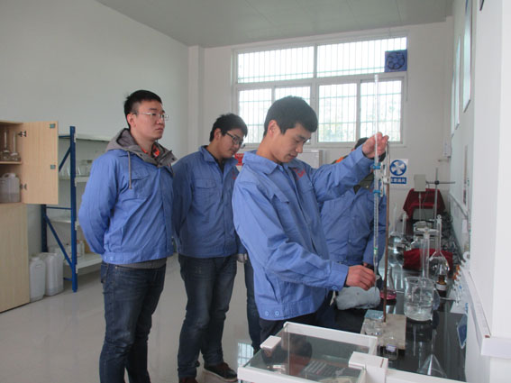 化学分析室负责人带领新员工做试验