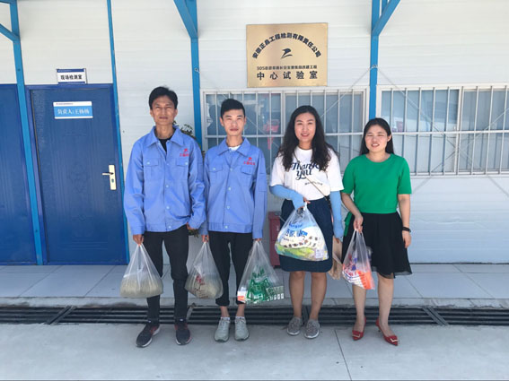 7月19日,烈日当头。经理助理张曼和刘岩深入305省道阜南长安至曹集段改建工程中心试验室和阜南县2018年农村公路建设项目工程中心试验室,看望慰问在生产岗位的一线职工,为他们送去了绿豆、白糖、毛巾、藿香正气水、龙虎人丹、风油精等防暑降温用品,并与职工亲切交谈,叮嘱大家要注意安全生产、防暑降温,确保身体健康。
